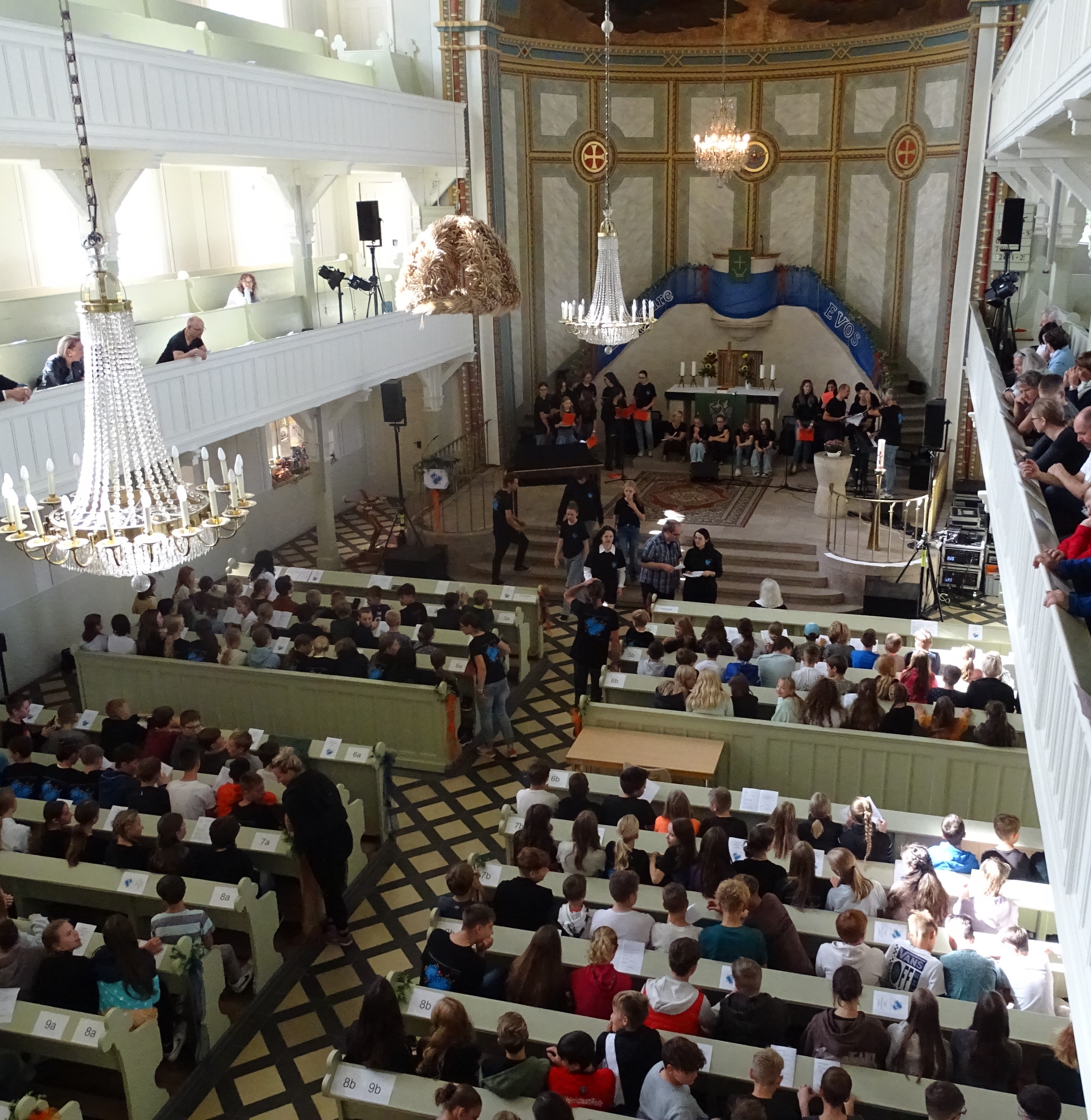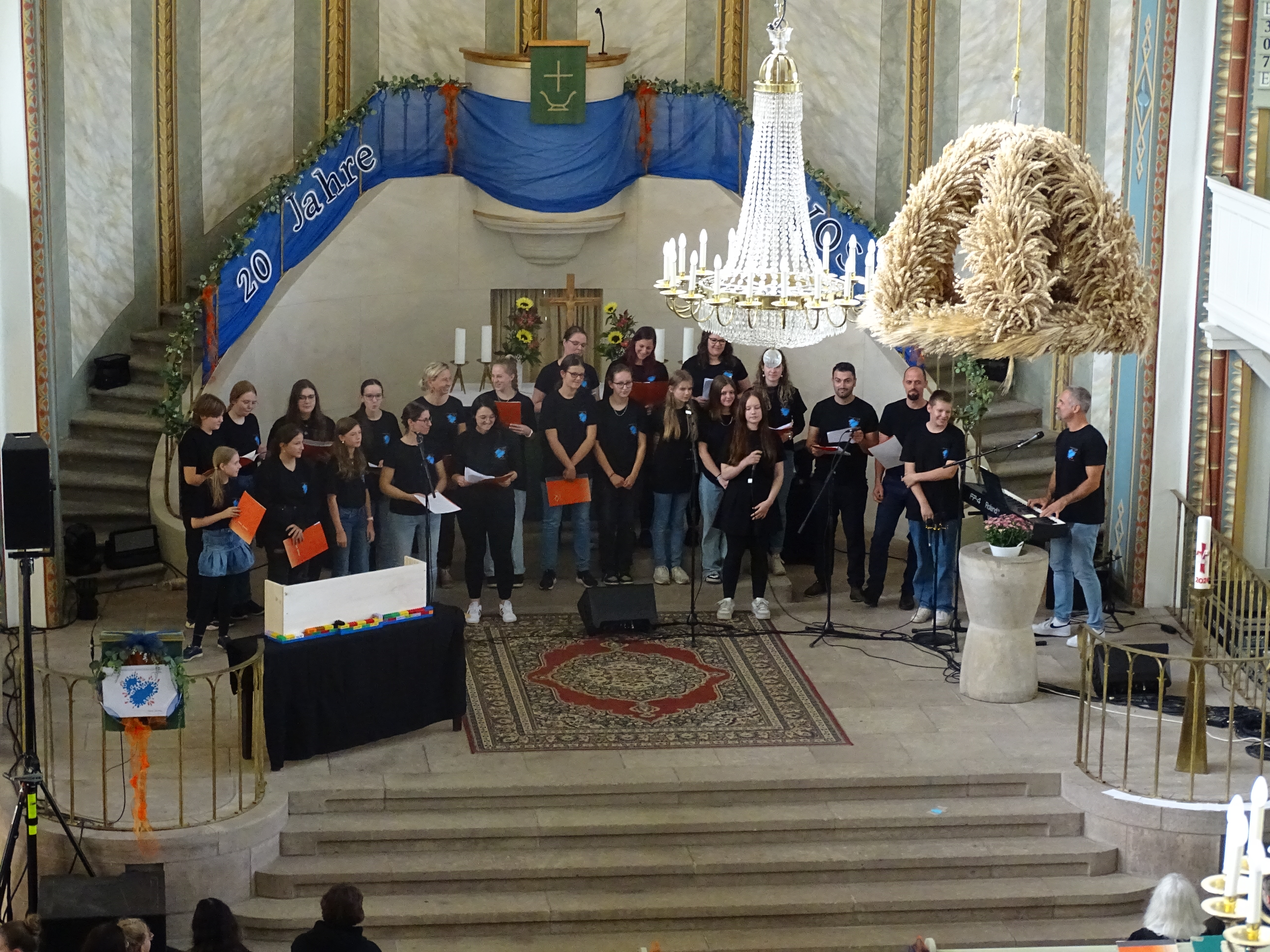 Ob Sonnenschein und frischer Wind nun ein himmlisches Geschenk oder einfach nur traumhaft schönes Herbstwetter waren, das spielt keine Rolle. Nach dem von zahlreichen Eltern tatkräftig unterstützten Gemeinschaftserlebnis Sternwanderung kamen alle Teilnehmer mittags erwartungsvoll, froh und etwas geschafft an unserer Schule an, um wenig später gemeinsam mit vielen weiteren Gästen in der reich geschmückten und bis fast auf den letzten Platz gefüllten Gersdorfer Marienkirche unseren Festgottesdienst zu feiern. Schüler, Lehrer, Mitarbeiter, Eltern, geladene Gäste, Vertreter aus Kommune, dem Landkreis, aus Landeskirche und Jugendarbeit, Freunde, Unterstützer und Beter – sie alle waren gekommen, um dankbar und staunend Rückschau zu halten, den zwanzigjährigen Weg zu betrachten: von der ersten Idee – dem Sprung ins kalte Wasser gleich - bis zu unserer heutigen Schule, segensreich wirkend und in der Schullandschaft fest etabliert. Sie konnten dem eindrucksvollen Schüler- Lehrer- Chor lauschen, die großartige Predigt hören und die souverän agierende Theater-AG erleben und dabei spüren, dass die Existenz dieser Schulgemeinschaft und dieser Schule nicht selbstverständlich und schon gar kein Selbstläufer ist, sondern dass die Idee von allen Schülern und Mitarbeitern gemeinsam getragen wird. Und man konnte es im wahrsten Sinne be-greifen, denn am Ende des Gottesdienstes entstand aus Lego-Duplo-Steinen, die mit den Namen aller Mitglieder unserer Schulgemeinschaft beschriftet sind, unser Schulgebäude als Modell, welches künftig im Eingangsbereich der Schule zu sehen sein wird. Nach dem Gottesdienst strömten alle auf das Schulgelände und in die Schule. 330 Schüler und Mitarbeiter unserer Schule und ca. 500 Gäste feierten gemeinsam ein perfekt vorbereitetes und fröhliches Fest; in dankbaren Rückblicken, froher Feierstimmung und optimistischen Ausblicken. Ein unvergesslicher Tag zwischen Festzelt, Sportplatz, Schulhof und Schule, mit Volleyballturnieren, Entdeckerständen, Kaffee, Kuchen und anderen Köstlichkeiten bis hin zum abendlichen Konzert in der Marienkirche war das Geschenk zum Jubiläum; gesegnet und Ergebnis unserer gemeinsamen, freudvollen, ideenreichen und anstrengenden Vorbereitungsarbeit.
